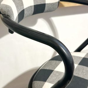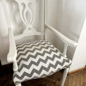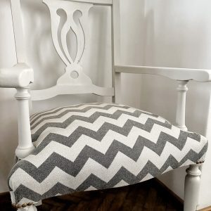 Par de mesitas americanas grises con madera lavada y tiradores de tela rústica.